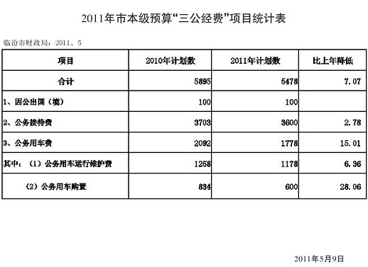 五、2011年市本级预算“三公经费”安排5478万元。其中:公务接待3600万元,公务用车运行维护1178万元,公务用车购置600万元,因公出国(境)费用100万元。