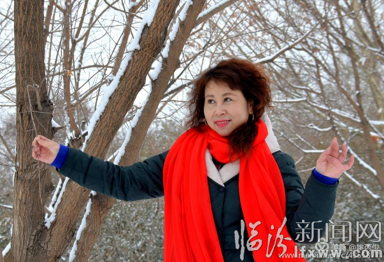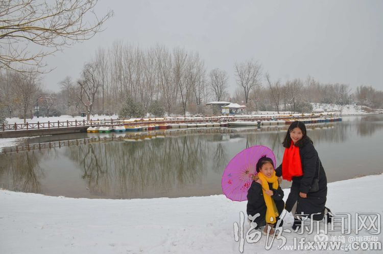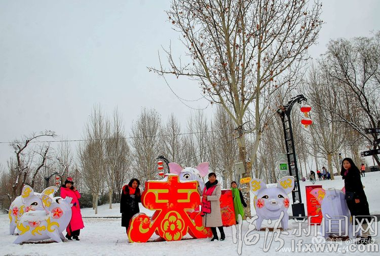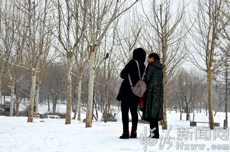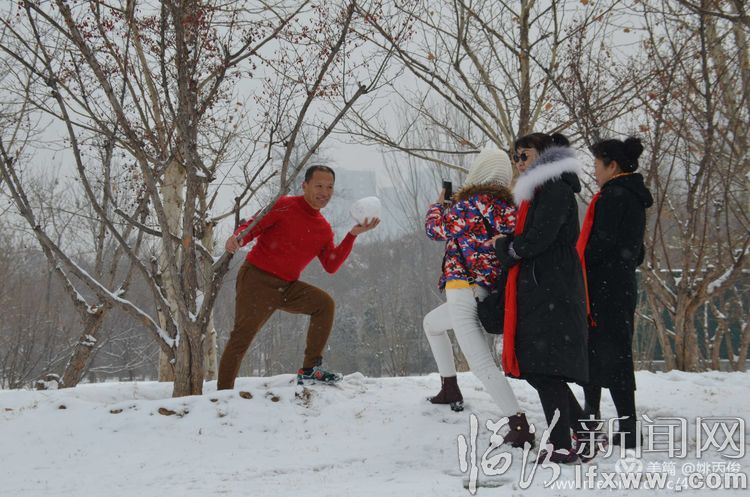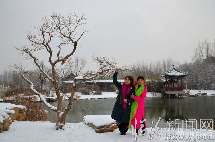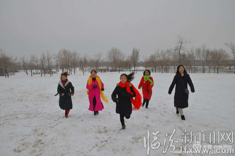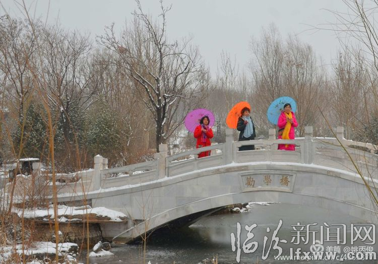 白雪却嫌春色晚,故穿庭树作飞花。在涝洰河生态公园里,游人争相拍照留念。