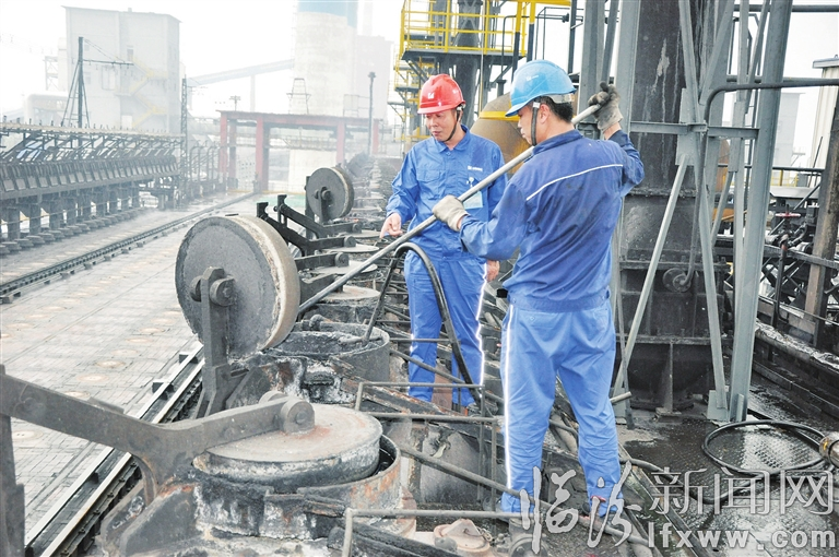 临汾新闻网讯 山西焦化股份有限公司焦化厂第一炼焦车间时刻绷紧安全生产弦,抓实抓细安全防范工作,坚决守住安全生产底线。图为5月14日工艺丙班班长郭进(左)正带领工人清理焦炉上升管。