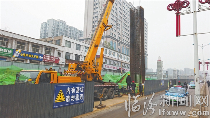 临汾新闻网讯 12月1日,在市区解放路立交桥项目施工现场,施工人员正按岗位表标准化作业对27号墩柱钢筋进行吊装作业。