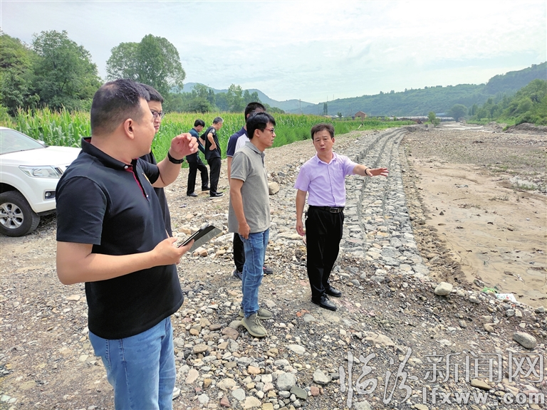 检查组一行深入续鲁峪河一线,沿着河坝徒步数公里,仔细检查该镇的各项防汛作业。