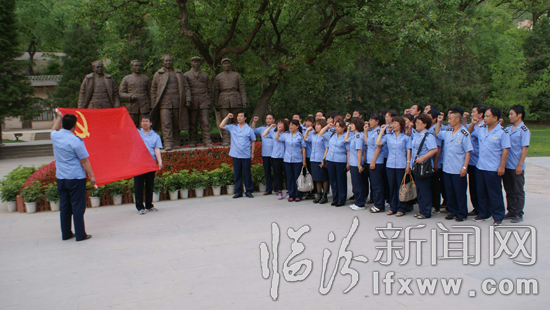 临汾新闻网讯(通讯员 郝婷婷)为迎接中国共产党90华诞,深情回顾党的奋斗历史,翼城县工商局以“党在我心中”为主题,组织全体干部职工分批赴革命圣地延安开展红色教育活动,此次活动弘扬了党的优良作风,学习了革命圣地的精神内涵,激励了广大干部职工继承和发扬党的光荣传统,解放思想、与时俱进、永葆先进性。图为第一批干部职工在延安枣园重温入党誓词。