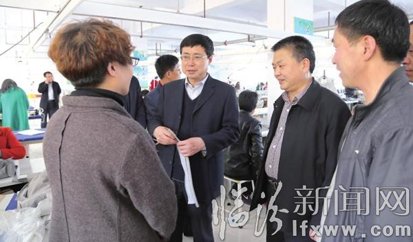 侯马市市委书记王煦杰(左二)在该市新兴纺织城欧森纳服装厂车间调研。 秦明忠 摄