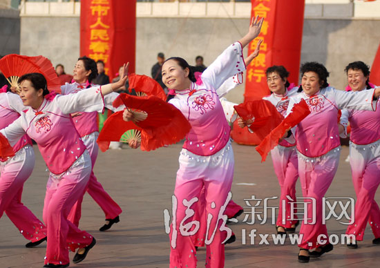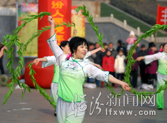 2月20日,来自街道社区的群众演员在广场表演舞蹈.