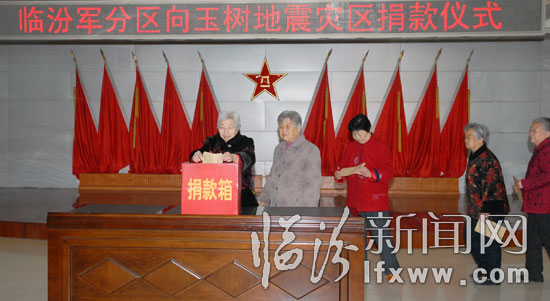4月21日,临汾军分区组织官兵、老干部及遗孀向玉树震灾区捐款。