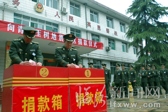 4月21日,武警临汾支队官兵向玉树震灾区捐款。