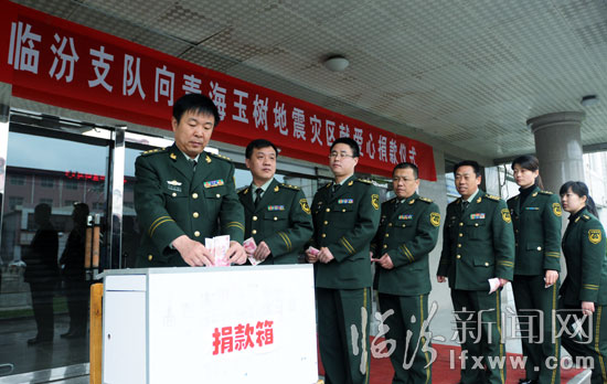 4月21日,武警临汾消防支队官兵向玉树震灾区捐款。