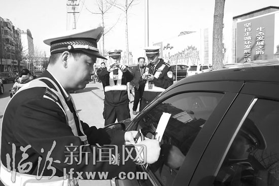 该中队队长许金生告诉记者,针对辖区乱停车现象,交警部门从16日起启动了非现场处罚,对乱停放车辆依法粘贴《违法停车告知单》,司机在3日之后15日之内到辖区交警部门交通违法处理大厅接受处理。(记者 赵文家 摄)
