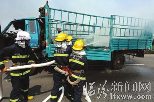 10时40分,事故现场工作正在有条不紊地进行中,突然位于最后的一辆货车发生起火,现场指挥中心紧急拨打了119消防电话。5分钟后,消防救援车辆到达现场,立即展开灭火工作,两分钟后,大火被扑灭。