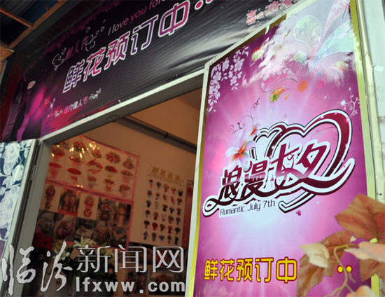 虽然不如西方情人节火爆,但商家还是通过“七夕”这一传统招牌给自己造势。记者在秦蜀路一家花店门前看到,商家已经在玻璃上贴上了七夕节的宣传广告,并且在店内货架上,增加了许多像“玩偶花束”、“情侣兔”等新潮礼品,来吸引情侣们的眼球。花店孙老板告诉记者,花店前的广告一个礼拜前就贴上了,为的是让顾客在七夕节前就能够预定鲜花,提前预定鲜花的价格既经济又实惠,而且还能避免由于“七夕”当天购买人多,造成货源紧张,价格翻倍的情况。