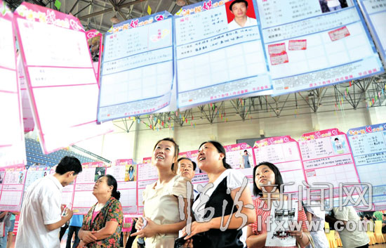 临汾新闻网讯 八月六日在我市首届相亲交友大会上不少青年男女及家长在信息公告栏浏览找寻合适的对象。 当日, 主题为“非诚勿扰媒动临汾”首届相亲交友大会举办旨在通过为不同年龄段的征婚者设立征婚专区为单身男女搭建一个相识和交流的平台, 吸引了众多单身男女前来寻觅姻缘。记者 闫锐鹏 摄
