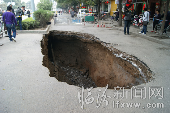 记者赶到现场后看到,地陷产生的裂口最大的地方约5平米。人行道上的柏油路面因移位产生碎裂,附近地面也可以明显看出发生沉降倾斜。