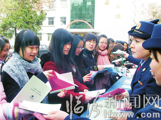图为市工商局的工作人员正在给学生们发放宣传资料