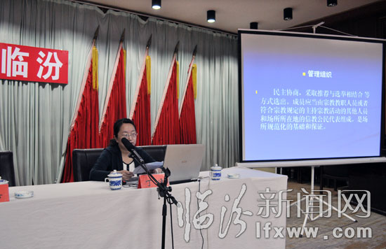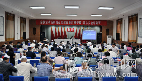 培训班由市民族宗教局局长杨兵主持,副局长丁逸向学员讲解了加强宗教活动场所规范化建设的意义、标准及措施,省工商行政管理学院高级讲师李鲜丁、尧都区公安消防大队防火工程师段毅军分别就宗教活动场所的财务管理和消防安全知识进行授课。通过本次培训,全面提高宗教活动财务管理水平,强化消防安全意识,规范宗教活动和宗教活动场所管理,进一步引深和谐寺观教堂创建活动。培训期间还进行了全市宗教政策法规学习月活动动员,向学员们赠送了学习资料。六.五普法期间,每年的6月被确定为“宗教政策法规学习月”,在宗教界人士和信教群众中集中开展宗教政策法规学习活动,提高法律水平,推动宗教界建设。