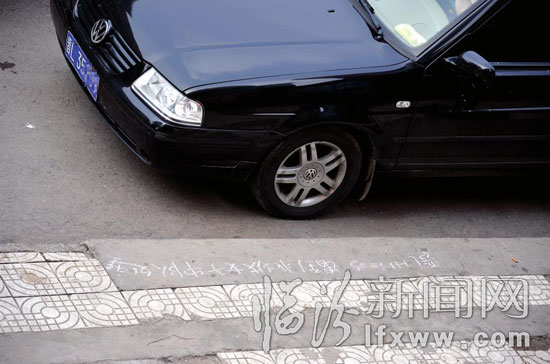 图为面对地面上写有“晋LHH0XX,请到北城女子中队处理”的违规停车告知单,一辆牌照为晋L352XX汽车,视而不见地停在了旁边。