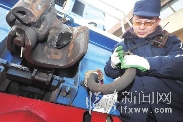 临汾火车站火车连接员庞大敦在检查机车风管皮圈。36岁的他,13年的春节都在岗位上度过,每天调动火车300多辆。他对家人说:我一个人不回家是为了千千万万的旅客安全回家,老婆您辛苦啦!”