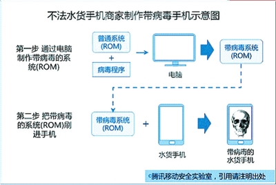 报告称,2013年2月,水货手机内置恶意扣费病毒暗扣话费、窃取隐私渐成公害。据腾讯移动安全实验室监测,2013年2月,春节期间的手机购买需求推动了水货手机出货量大增,水货手机销售市场空前繁荣,导致ROM病毒感染的用户数大幅增长,ROM内病毒渠道占据11.26%的比例。