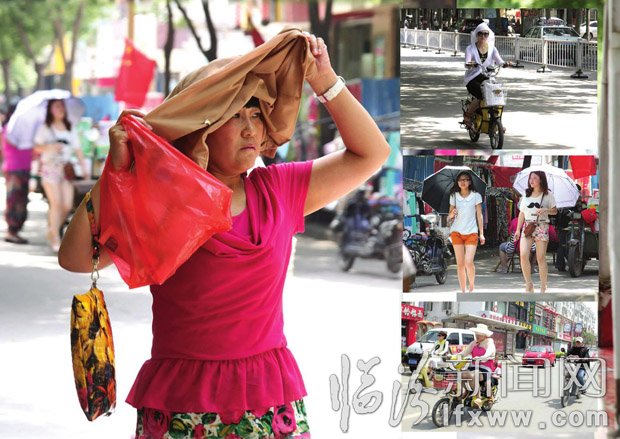 街头闹市,市民们“全副武装”抵御高温。记者 郝海军 苏亚兵摄