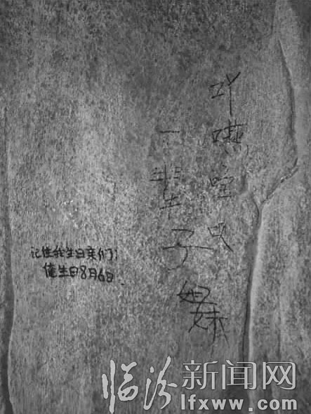 汾水古韵景点位于汾河公园的中段,高大的假山上流水哗啦,假山之侧,有桥有路可供游人散步。记者在现场看到,假山之内的墙壁上有“左哥哥,我爱你”帅哥,QQ17659570”XX、XX,做一辈子的姐妹”“记住我生日亲们,俺生日8月6日”ZKQ到此一游”三个姐妹一起疯”燕子、信子,到此一游”有情人终成眷属”,更有甚者还有“找一美女,QQ2268842693”,除了文字外还有一箭穿心等图案。