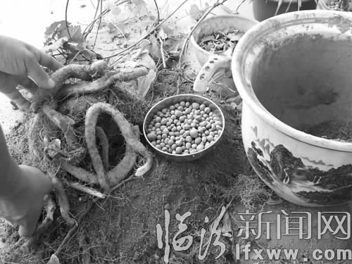记者在张师傅家门口看到,山药种在一个高25厘米,直径30厘米的花盆里,山药藤蔓缠绕在花盆土堆上的几根铁丝上,藤蔓上的叶子已经发黄,山药被张师傅连同土团一同拔出,长成的山药位于土团底部,山药蛇一样缠绕在一起,有的山药较粗,形如小孩手掌样,有的较细,如筷子一般。