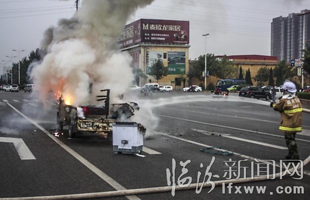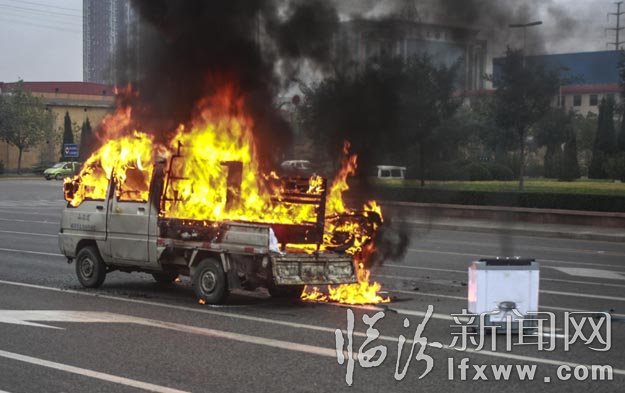 8月30日12时许,在我市锣鼓大桥东头附近一小型货车自燃,瞬间火苗蹿起一米多高。我市消防支队119指挥中心接到群众报警电话后,特勤中队官兵迅速赶赴现场施救。