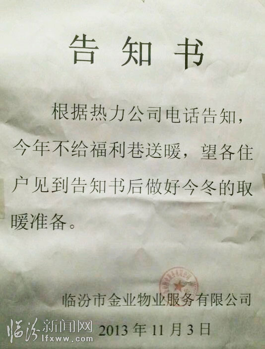 临汾新闻网讯(记者 杨全)11月以来,天气日渐寒冷,百姓翘首以待,期盼大暖早日到来,然后过一个温暖的冬天。可是11月3日的上午,位于尧都区福利巷的金业物业公司却在自己所服务的小区内张贴了一张告知书:“根据热力公司电话告知,今年不给福利巷送暖,望各住户见到告知书后做好今冬的取暖准备。”