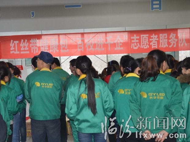 临汾新闻网讯(记者 席沛钊)2014年11月25日,以“爱心暖职场,礼包送健康”为活动契机,团市委、中华红丝带基金会有关工作人员和志愿者一同走进山西光宇半导体照明公司,向100多名企业职工发放“红丝带”健康包。