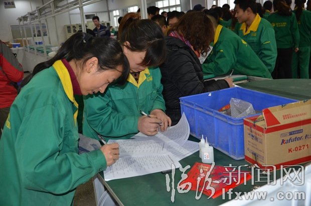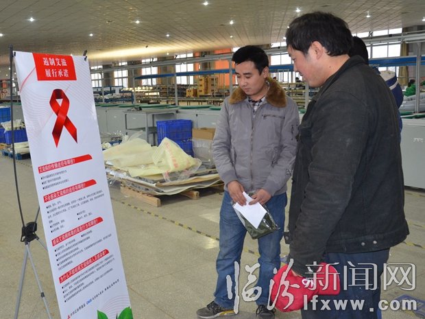 中午2时30分,发放活动在厂房门口举行。当天,阴有小雨,志愿者和职工们热情都很高,工友们排着队站在“红丝带”健康包发放处等待,志愿者们将中华红丝带基金调查问卷和青春红丝带艾防志愿者登记表一一发给工友们。工友们也很配合,拿到调查问卷后仔细填写,遇到不清楚的问题与其他工友讨论。
