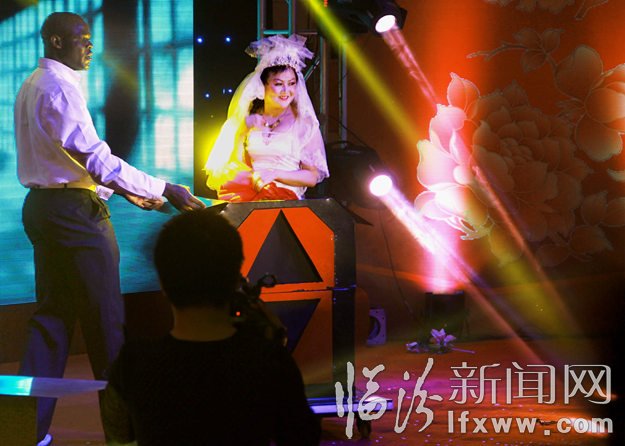 杨乐乐和加拿大魔术师邓峰表演的《人体分离》