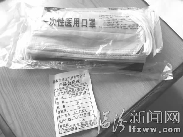 记者看到,在一个透明塑料包装袋里整齐摆放着一沓蓝色口罩,包装袋正面除了明显标注着“一次性医用口罩”的信息外,还有厂名、厂址、企业网站等信息;其次,记者还看到了一张“产品合格证”,上面写着生产批号:20141228,生产日期:2015年1月6日,数量为20个,有效期为两年等信息。从外观来看并没有任何异样,然而,每取出一个口罩,都伴着一股浓浓的中药味。
