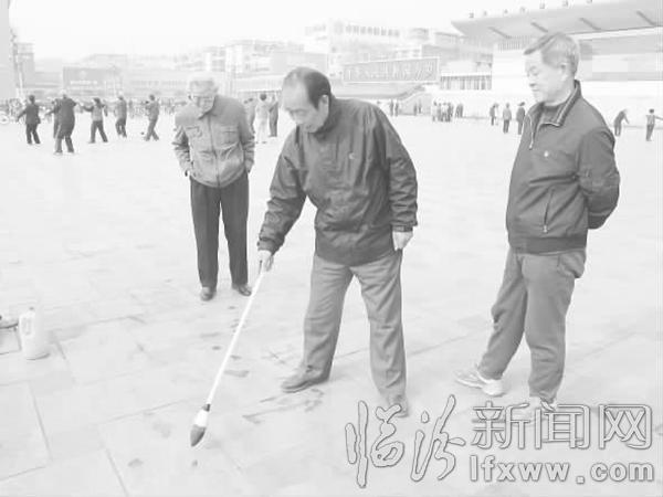 临汾新闻网讯 在平阳广场上,有一位老人每天准时到达,用一根“泡沫笔”,蘸着清水在地上“挥毫泼墨”,他起笔熟练,收笔自如,吸引了诸多市民的目光。