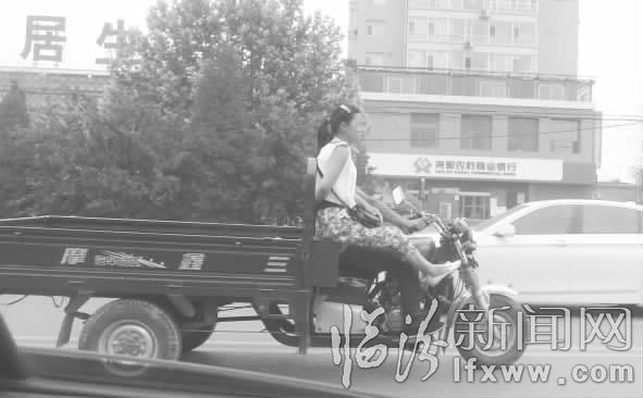 在河汾路上,一辆三轮车拖着另一辆三轮车,摇摇摆摆地在路上行驶;还有一辆载货三轮车,一位女士直接坐在三轮车的工具箱上,一旦遇上急刹车,就有可能酿大祸。记者 苏亚兵 摄影报道