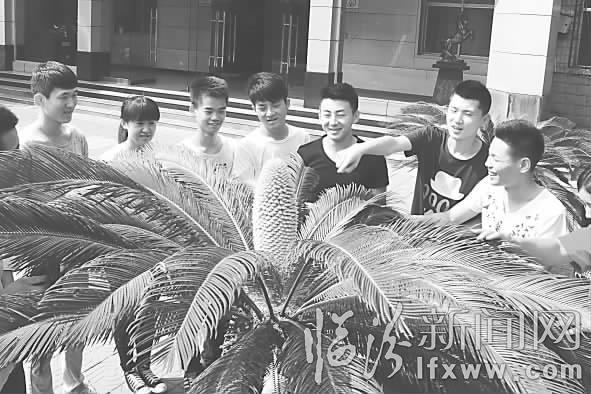 临汾新闻网讯 6月21日,山西信息职业技术学院内的两株20余年树龄的雌、雄铁树竞相开花,吸引了众多师生前来观赏。