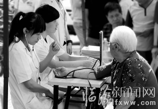 临汾新闻网讯 日前,为了呵护市民在高温天气的健康,临汾市建宁医院在尧都区解放西路设立免费义诊服务台,为过往的市民免费测量血压,提供咨询服务,免费发放宣传彩页,得到广大市民的欢迎。图为医护人员在义诊服务台为市民测量血压。