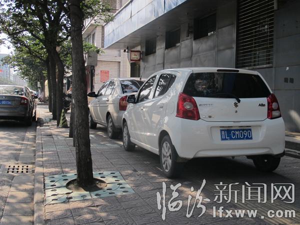 在解放路中段一非机动车道上,虽然路边竖有“全路段违规停车拍照拖走”的提示牌,却仍有车辆停放在提示牌之下。不仅如此,人行道、盲道也都变成了“停车场”。