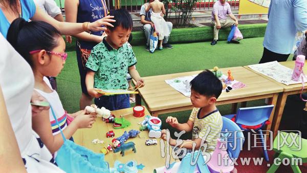 “我这车可厉害了,还有红外遥控器……”晨晨边说边向小客人演示玩具车的玩法。“我想买一把……你要等一会儿,我回家跟我妈妈要钱。”小客人说。