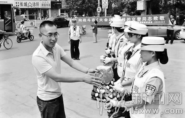 7月13日,是入伏第一天,临汾西雅图摄影基地为市交警支队北城大队女子中队的交警们送去了消暑用品,向战斗在“大会战”一线的交警致敬。