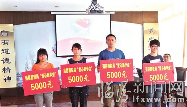 从2013年开始,国税局干部职工自发从个人的文明创建奖中拿出一部分成立了“爱心基金”。当年8月,他们了解到,有两名成绩优异的学生在考取大学后因家庭条件差无法负担上大学的费用,当即决定进行资助,在道德讲堂上开展了爱心助学捐款仪式,全体税干及前来参加活动的社会人士纷纷伸出援助之手,共计捐款24500元。