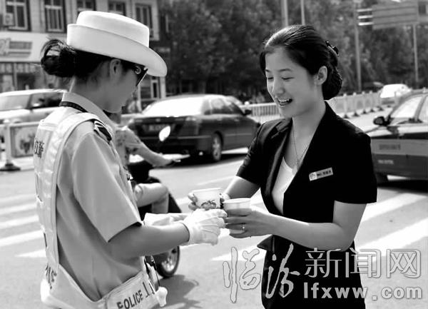 临汾新闻网讯 连日来,持续高温,大地像蒸笼一样。为了守护道路交通安全,市区水厂岗路口的交警们依然坚守在一线,挺拔的身姿成了烈日下一道亮丽的风景。图为我市爱心企业为交警们送去了降暑绿豆汤。 记者 孙国芳 摄