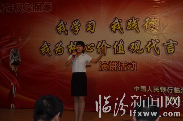 活动开始,中支党委委员、工会主任程文彬作了热情洋溢的致辞。他指出,党的十八大提出的24字社会主义核心价值观,是追求真善美的价值观,它体现在个人身上是品行,体现在家庭中间是家风,体现于国家社会是共同理想和民族精神,体现在人民银行职工身上是团队是协作,它需要学习培养,更需要自觉践行。希望干部职工通过这次演讲活动,进一步有效活跃工作氛围,提升思想境界,带头把社会主义核心价值观学习好、践行好,不断增强自我的价值判断力和道德责任感,推动形成人人参与、人人实践的生动局面,汇聚奋发向上、崇德向善的强大力量。