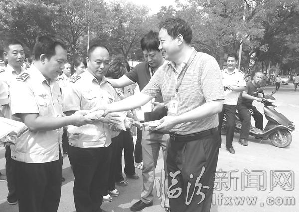 临汾新闻网讯 8月10日,尧都区乡贤街办事处领导和企业家一行,在脸谱大桥附近慰问了在酷暑下仍坚守一线的南城大队的市容执法队员,并为他们送去了防暑降温用品。记者 梁丽摄