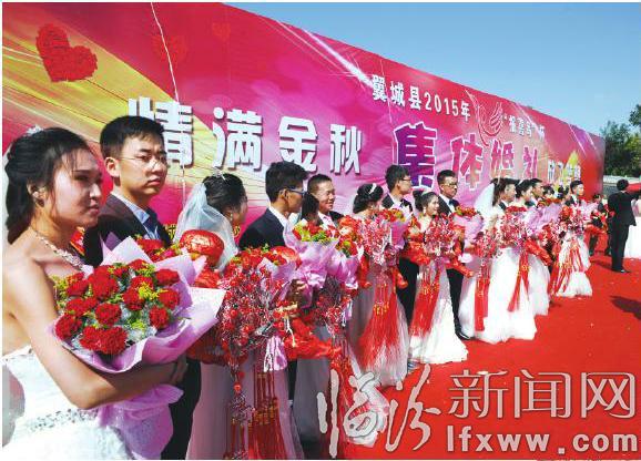 10月1日,16对新人在翼城县桐封公园举办了“情满金秋放飞梦想”集体婚礼,婚礼现场既庄重、浪漫、热闹,又简约、低碳、环保,成为该县国庆节期间一道靓丽的风景。 记者 李自强/摄