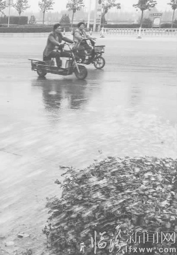 记者随即赶赴现场,只见一水管肆意喷水,道路非常湿滑,水流已经穿过滨河东路,过往此处的非机动车辆小心翼翼。一名工地上的工作人员称:这是绿化用水,喷头不知道让谁拧下来了,目前已经修复。”记者 张蕴强摄