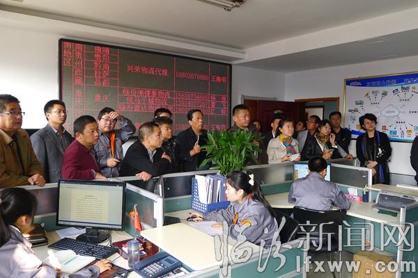 在兴荣物流公司自主研发的交通运输物流公共信息平台监控室,考察团一行听取公司负责人平台运行情况介绍,对兴荣公司投入巨资研发建设的物流联盟公共信息平台赞叹不已。