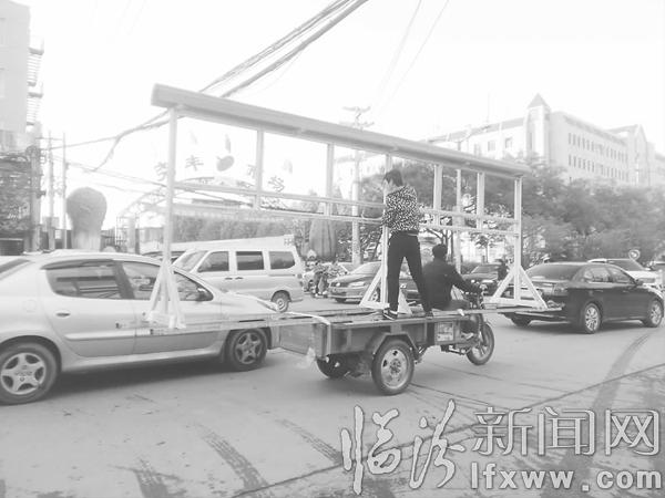 临汾新闻网讯 10月26日下午,一辆电动三轮车载着一个超大铝合金框架行驶在鼓楼南大街,车上还站立着一个人扶着,随车来回摇晃,如耍杂技一般,导致过往车辆纷纷躲避。如此“杂耍”般行车载货,存在很大的安全隐患,稍有不慎,将造成严重后果。