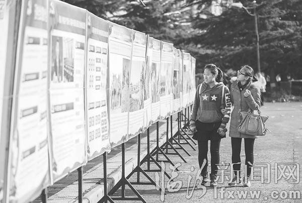临汾新闻网讯11月25日,在山西师范大学巨人广场前,该校以25块展板展出了“学习十八届五中全会精神”的42幅图片,在校园内掀起了关注五中全会、关注国家经济发展、关注“十三五”规划的热潮。图为学生观看展板。 记者 张蕴强 摄
