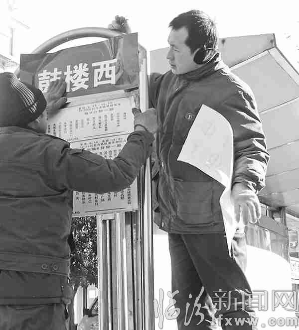 临汾新闻网讯12月15日,寒风刺骨,市公交公司的职工却冒着严寒,为方便广大市民的出行及时更换道路指示牌。 该公司负责人介绍,随着兵站路长途车站搬迁到汾河西新客站,公司新增了15路公交车。最近两个月来,为改善广大市民出行,公司还增加了5路、6路、13路公交车。一个多月来,公司制作了新的站牌,组织员工对新增线路逐线、逐站进行更换。 记者 王隰斌 摄