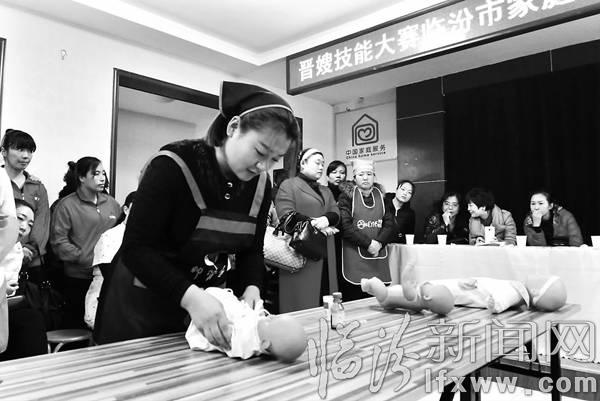 临汾新闻网讯 1月2日,临汾家庭服务业协会举办了晋嫂技能选拔大赛,我市近20家家政公司的选手在养老护理、孕婴护理、家庭保洁三个项目中展开了激烈的竞赛。图为:帅管家家政公司员工正在展示如何正确护理婴儿。记者 陈华摄