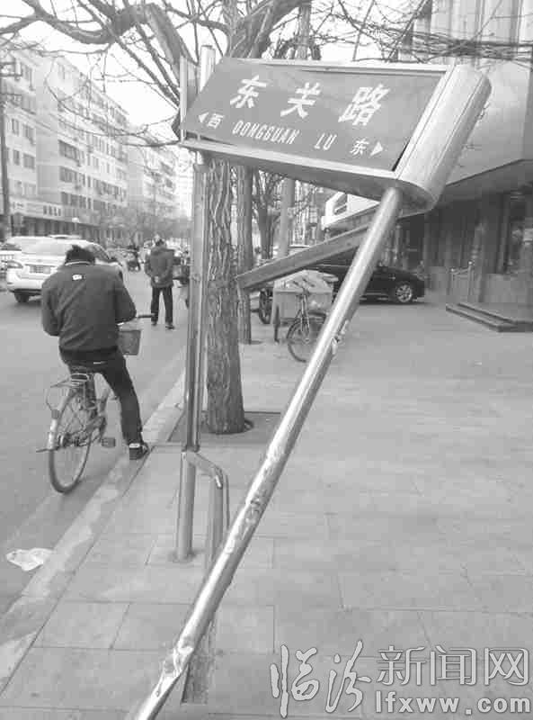 临汾新闻网讯 1月9日,市民陈先生反映,在东关路与迎春街交叉口的一个路牌倾斜在路边。