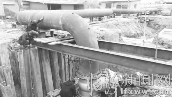 新架设的旁通管道工程,是在原破裂管线两端重新架设等口径供热管道,使原管道重新恢复供热,这是完成供热抢险的关键所在。这条旁通管道长约45米,直径0.9米。
